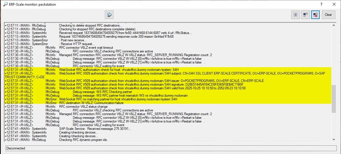 - The ERP-Scale monitor will show an RFC authentication error: