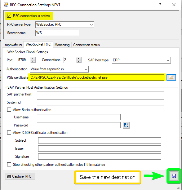- Save the new RFC destination