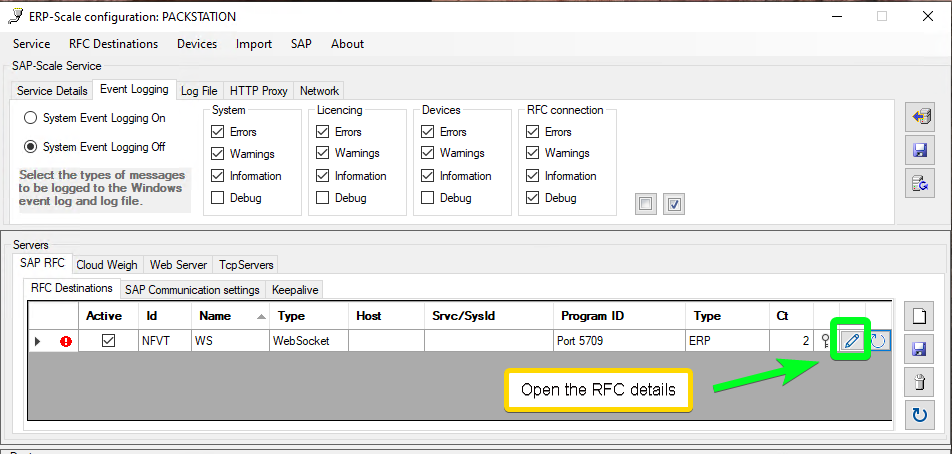 - In the ERP-Scale configuration utility, open the RFC connection details: