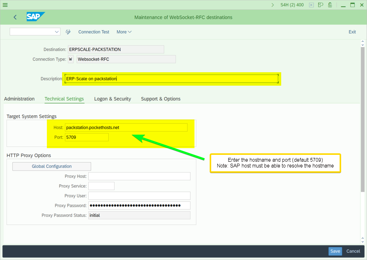 - Specify the FQDN of the ERP-Scale PC and the TCP port used for communication. Default port is 5709: