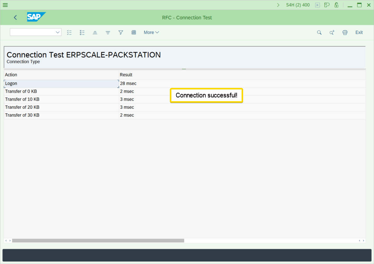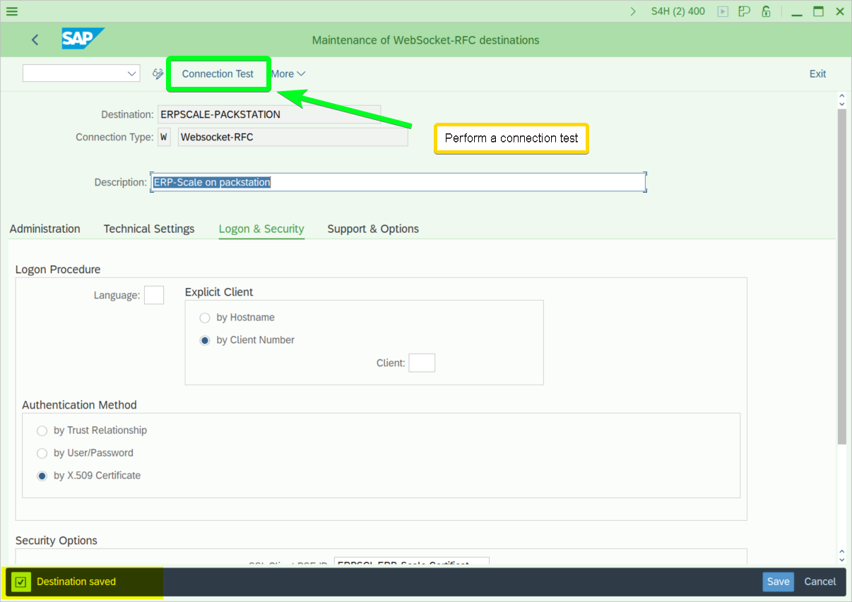 - Save the new RFC destination and perform a connection test: