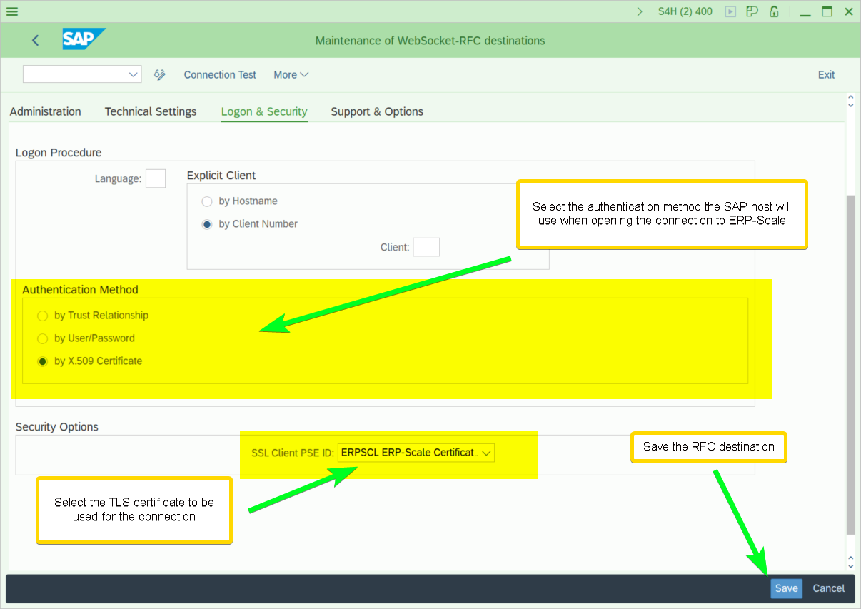 - Select the TLS certificate used for the communication and the authentication method. ERP-Scale supports fixed user/password and X.509 certificate