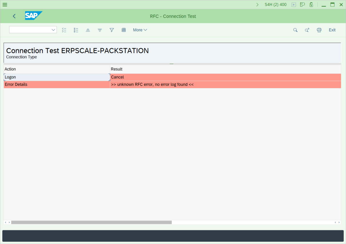 - If a different error is shown in the SM59 connection test and no authorization error is shown in ERP-Scale, perform a trace in SAP using transaction SMICM.